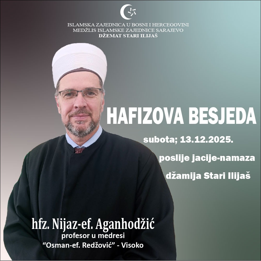 Obavještavamo Vas da nastavljamo sa ciklusom predavanja koje u našem džematu održava hfz. Nijaz-ef. Aganhodžić pod nazivom “Hafizova besjeda”. Hafizova besjeda će se održavati jednom mjesečno u našoj džamiji, subotom poslije jacije-namaza. Kroz Hafizovu besjedu upoznajemo se sa životopisima Allahovih poslnika, a.s., uzimajući pouke za vrijeme u kojem živimo. Bujrum.