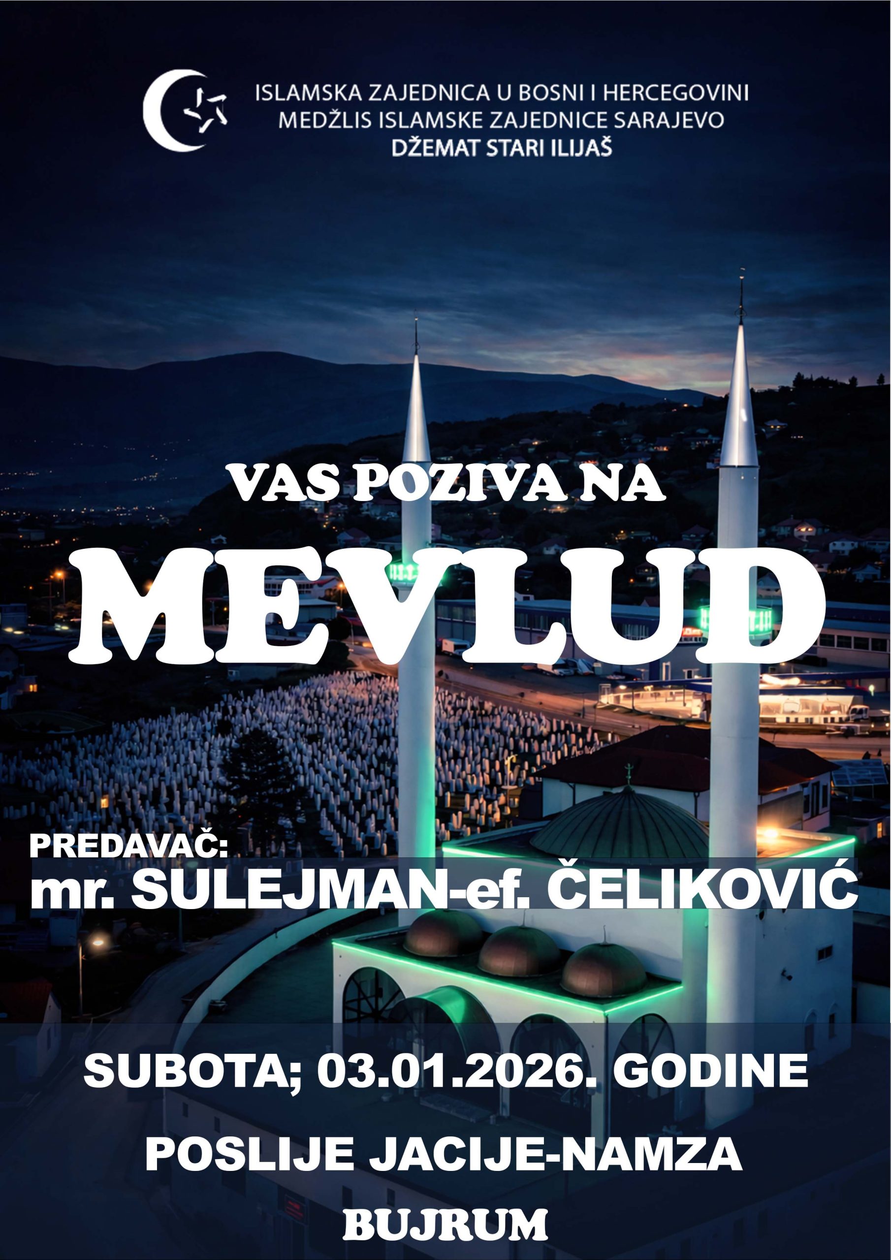 U subotu, 03.01.2026. godine poslije jacije-namaza, je Mevlud u našem džematu povodom mjeseca redžeba, mubarek noći i skorog dolaska mjeseca ramazana. U ovom mjesecu Allahov poslanik Muhammed, a.s., je učio dovu: Allahu blagoslovi nas u redžebu i ša'banu i daj da dočekamo ramazan.