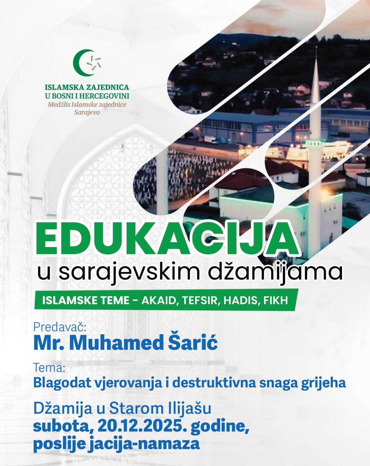 Aktivnosti mladih Mreža mladih Obavijesti Ostale vijesti VIJESTI Vijesti iz džemata NAJAVLJUJEMO: predavanje mr. Muhamed-ef. Šarić 17. Decembra 2025.17. Decembra 2025. Džemat Stari Ilijaš foto U subotu, 20.12. poslije jacije-namaza, je drugo predavanje u našoj džamiji u sklopu Edukacije u sarajevskim džamijama. Gost predavač je mr. Muhamed-ef. Šarić. Bujrum.