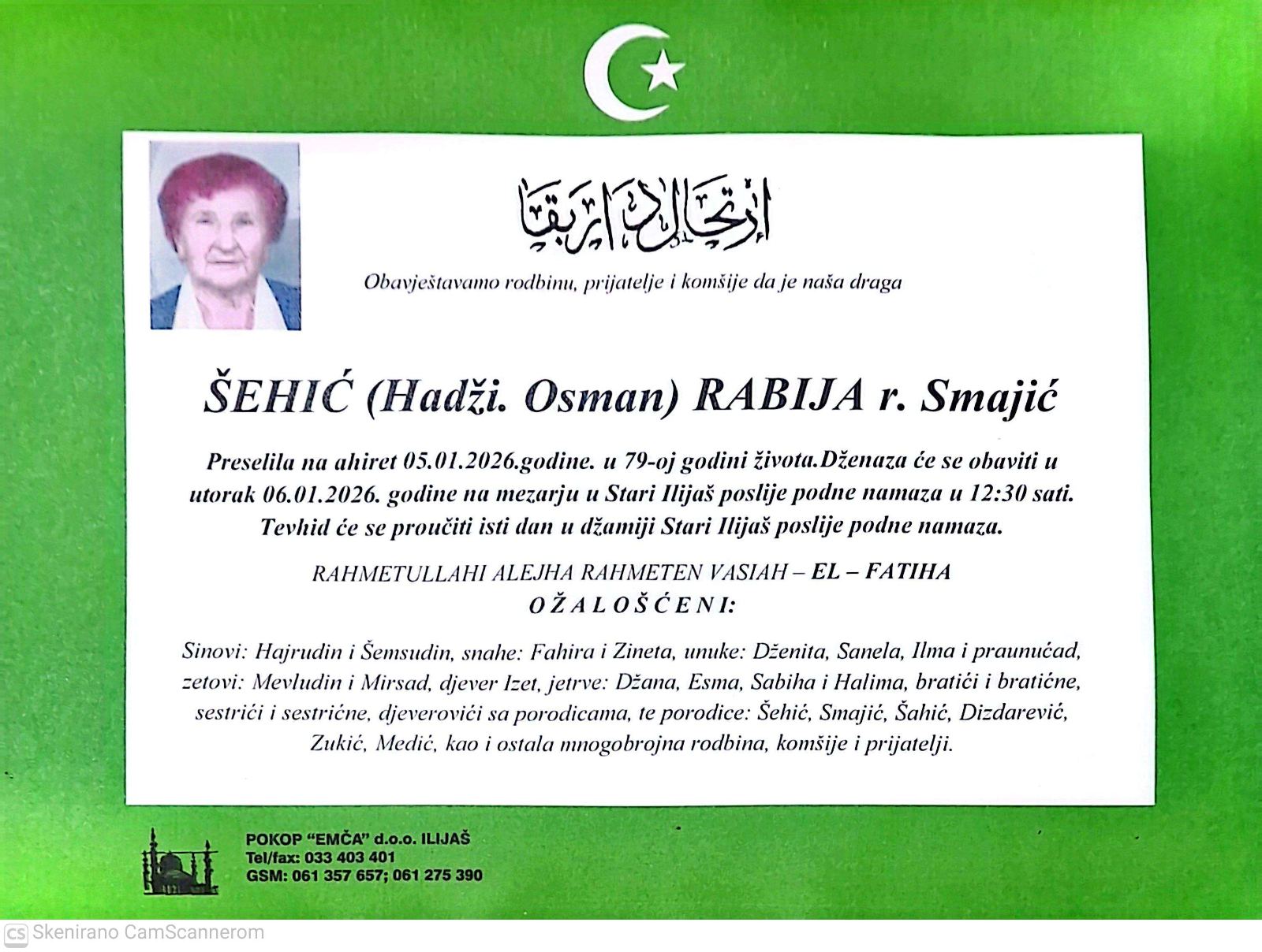 2026. godina Šehić (h. Osman) Rabija rođena Smajić 5. Januara 2026.18. Februara 2026. Džemat Stari Ilijaš foto